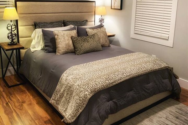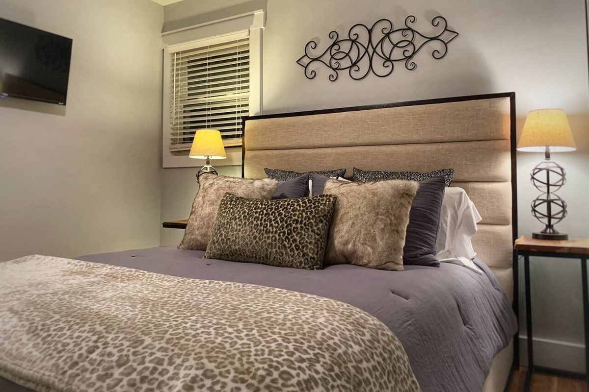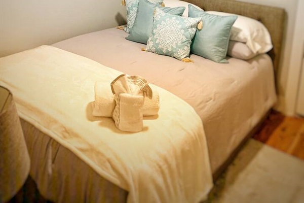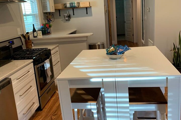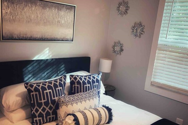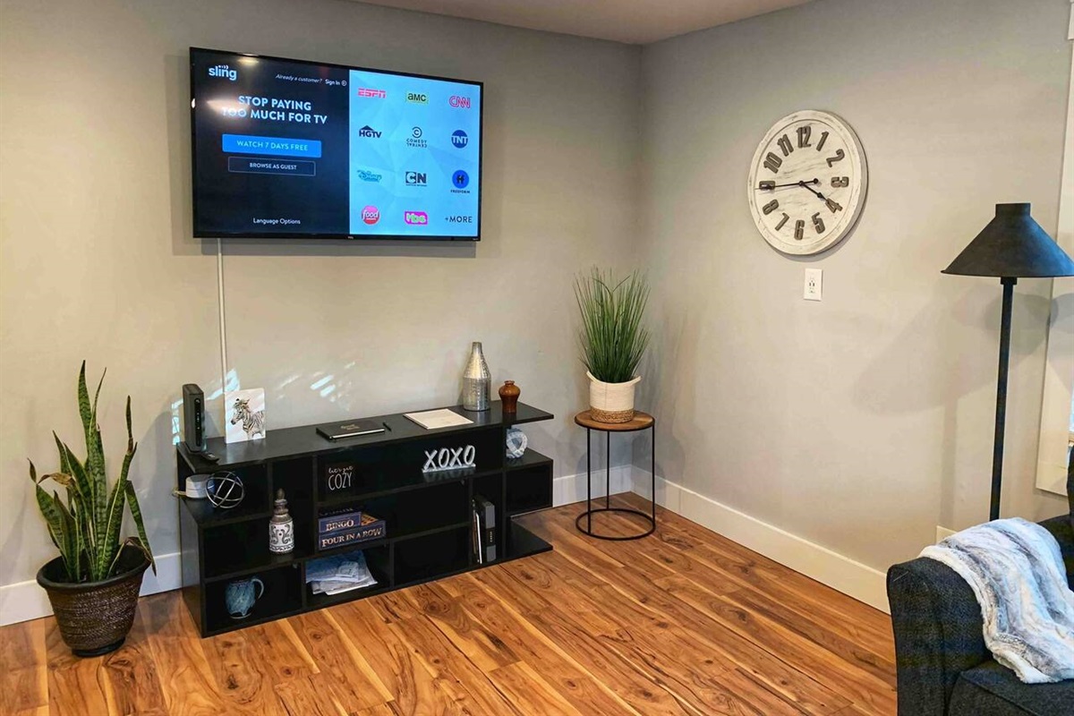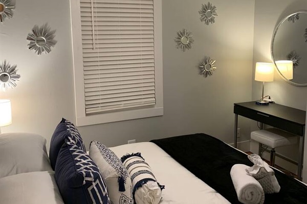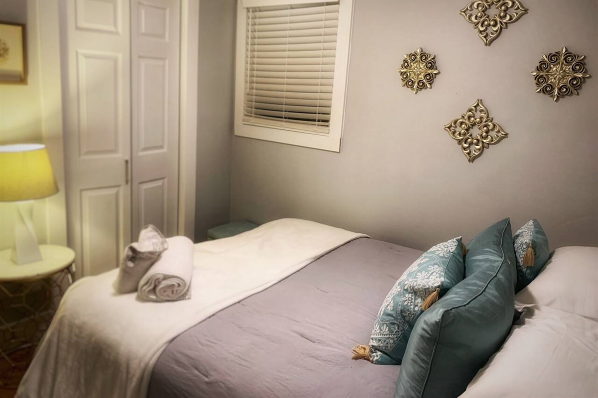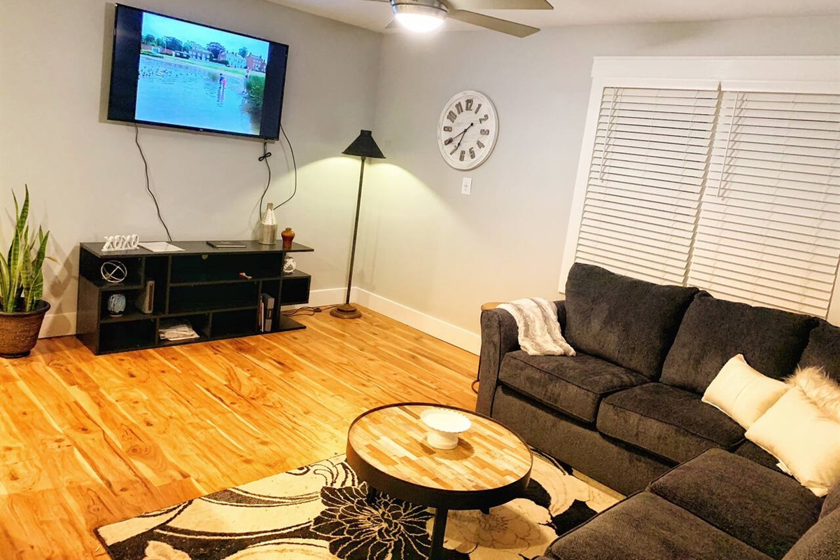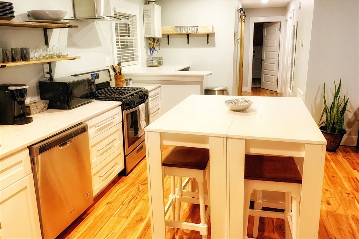 The kitchen, while small, is fully renovated and stocked with everything you need, including a gas stove. The adjoining living room features a large smart TV where you can stream your favorite shows. All the beds are new, with hybrid mattresses that our guests love, and each bedroom has its own smart TV.