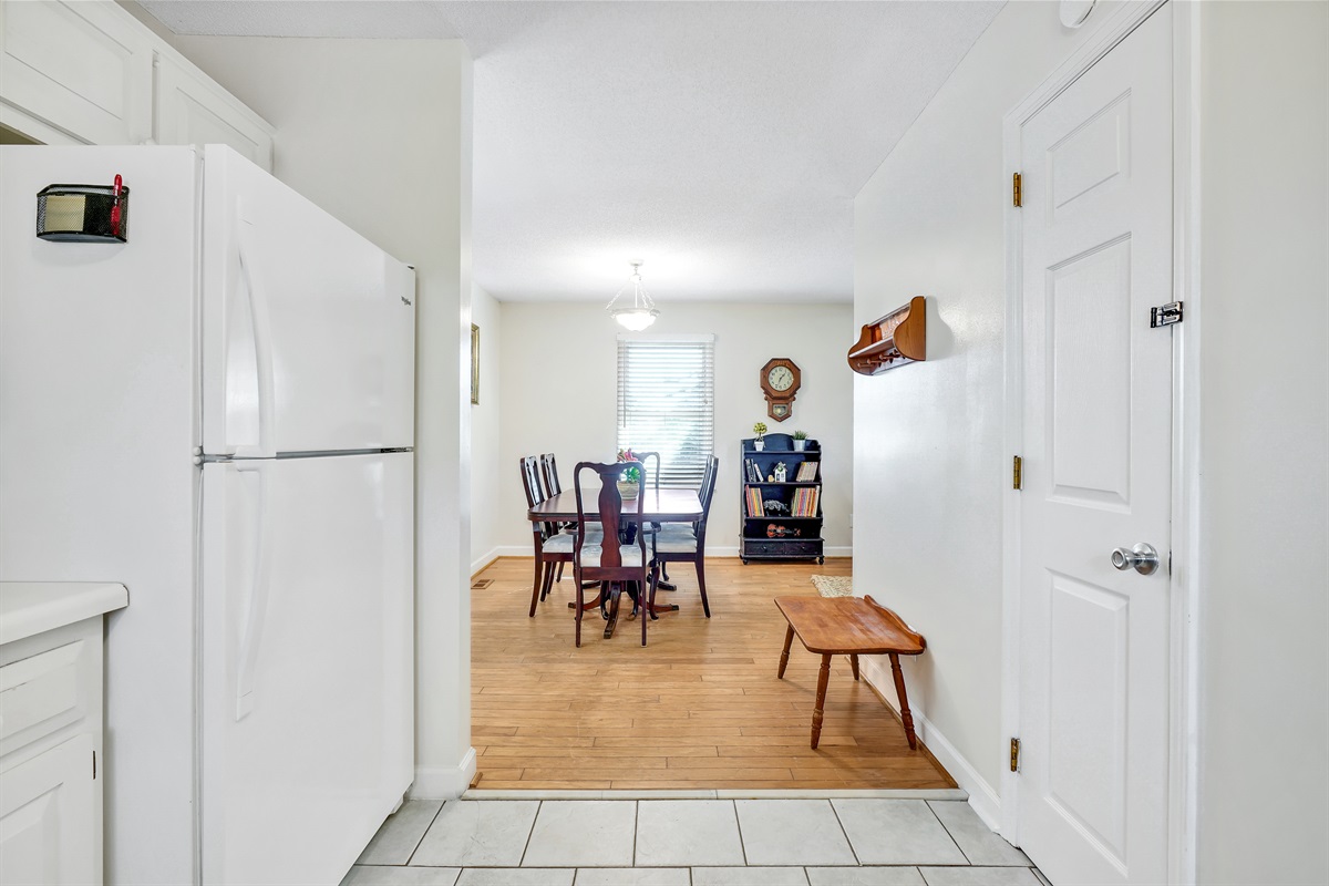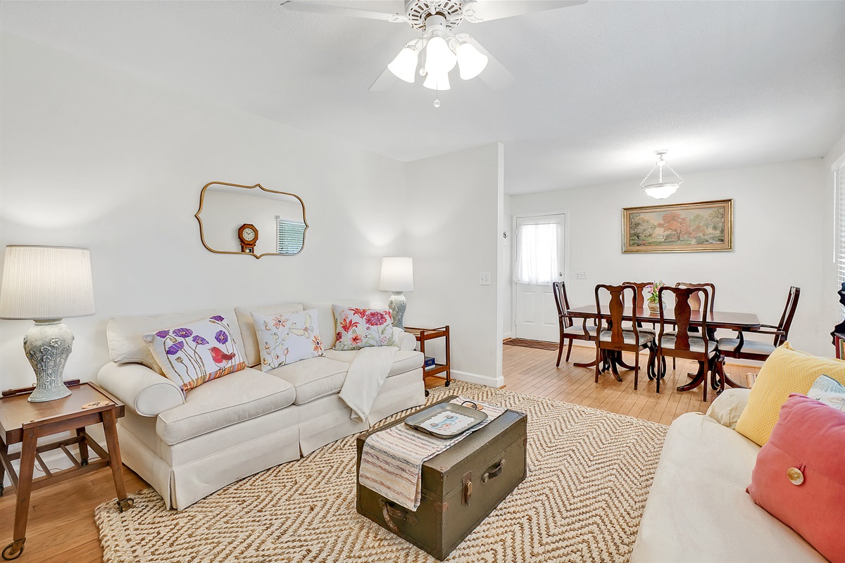 Step inside Golden Retreat and discover a thoughtfully designed living space adorned with coastal-inspired decor and modern comforts. This homes layout seamlessly connects the living area, dining space, and kitchen, creating a welcoming environment for gatherings and relaxation.