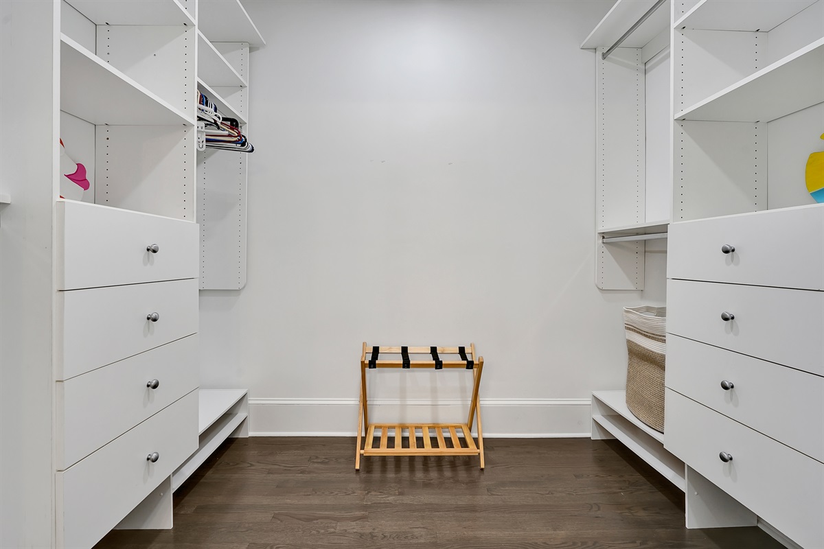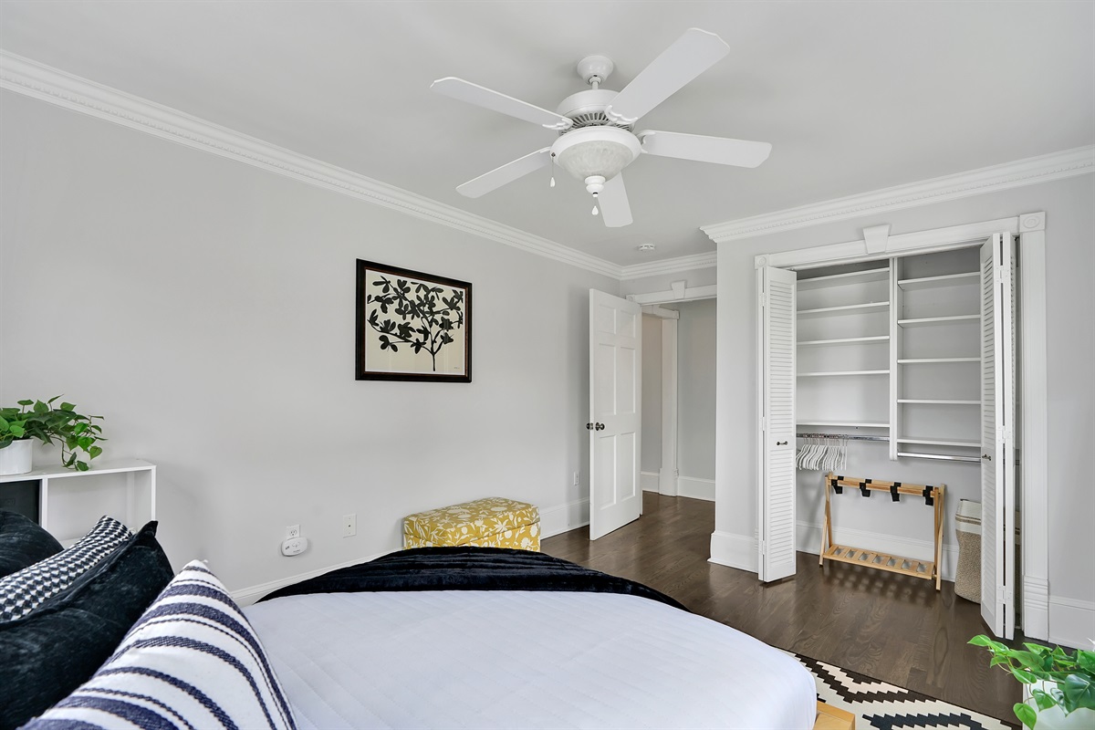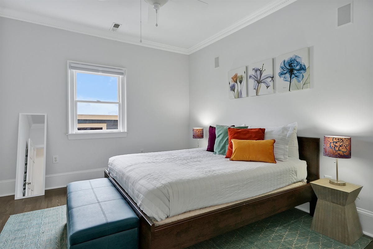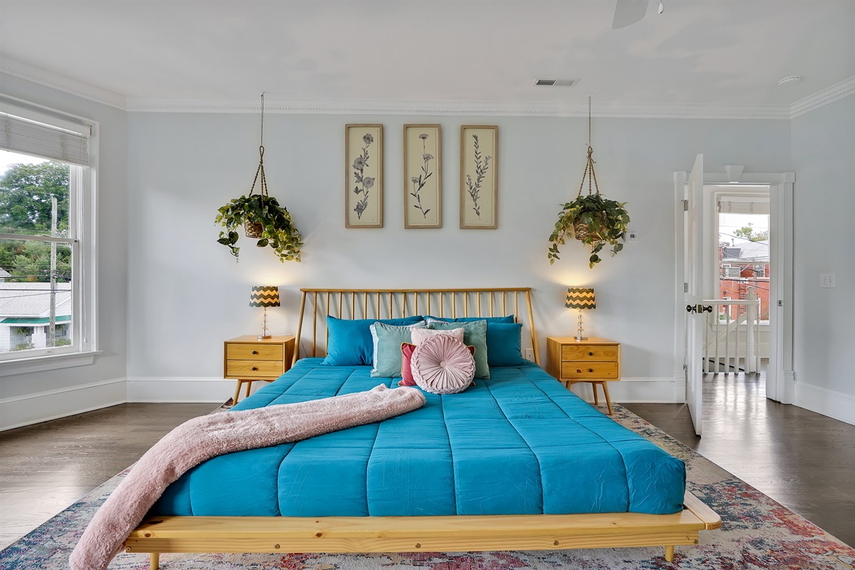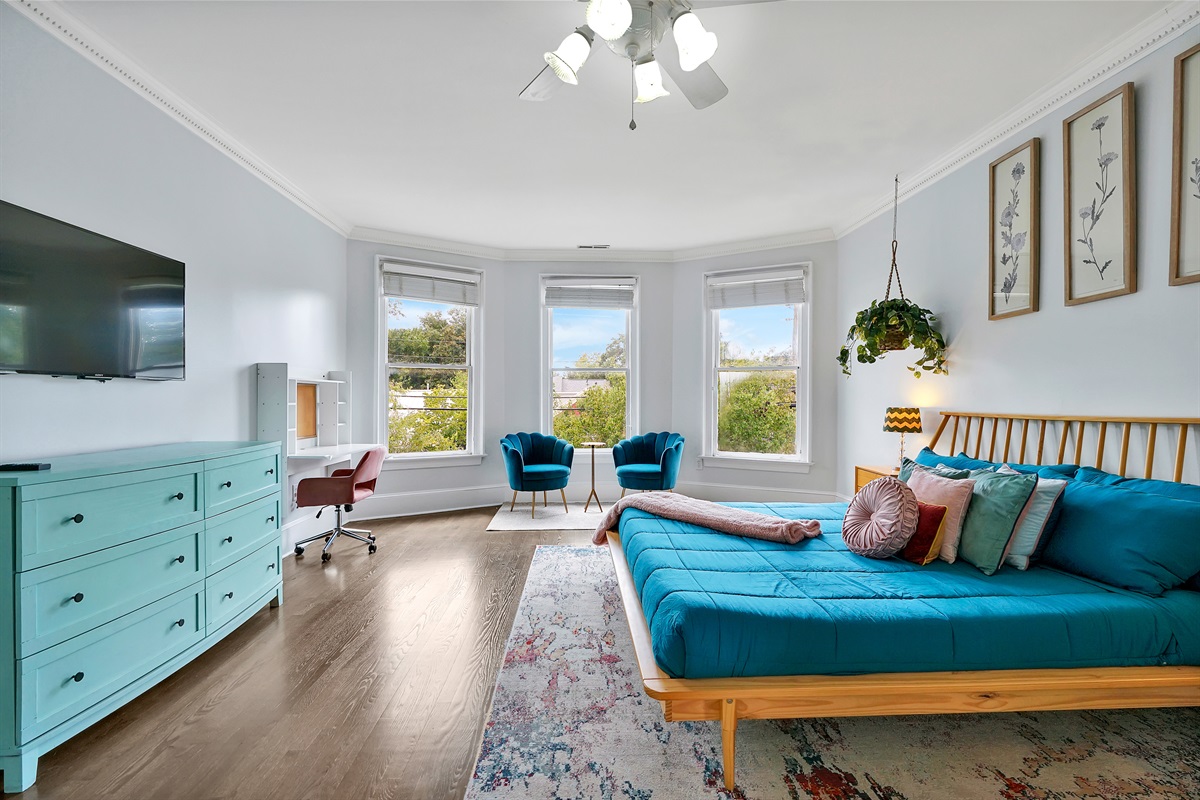 The oversized primary suite has a comfortable king bed, lovely natural light, a walk in closet, an office, and a large bathroom with tiled shower.
