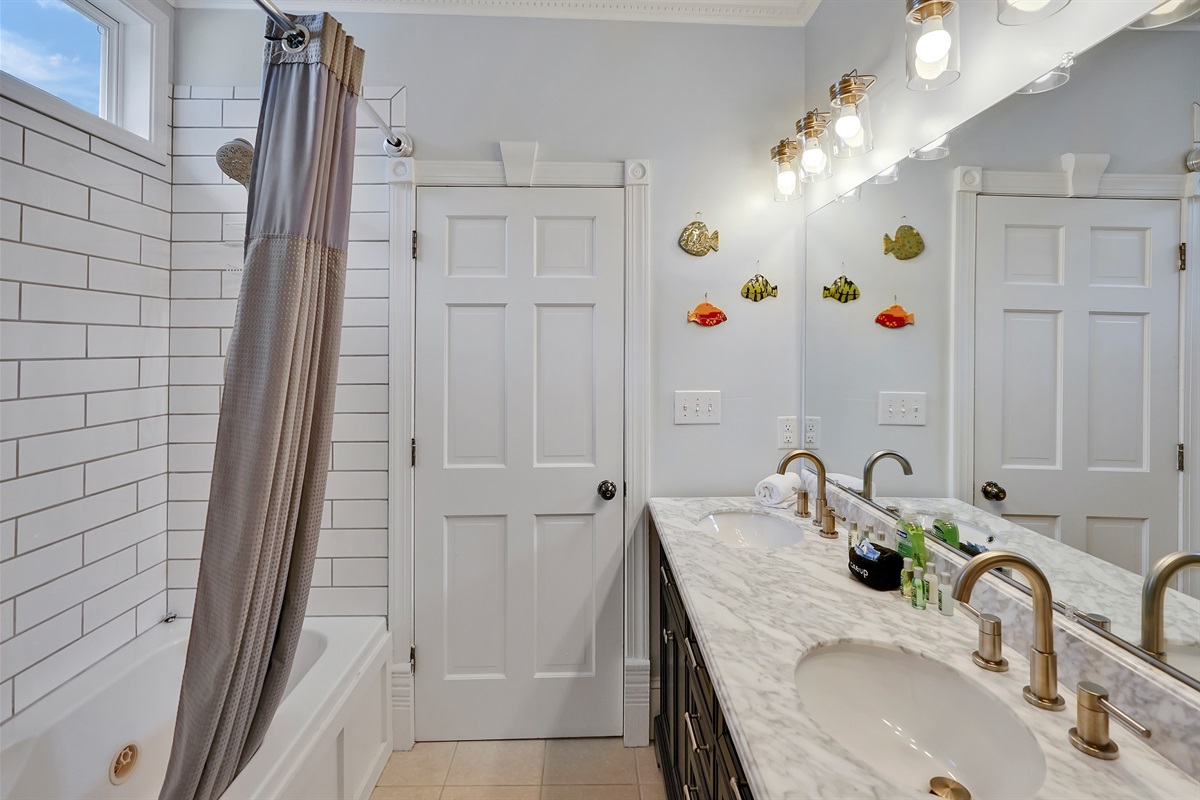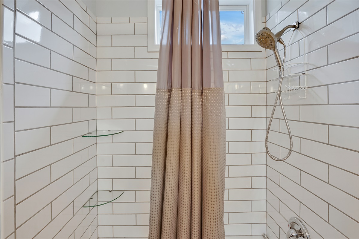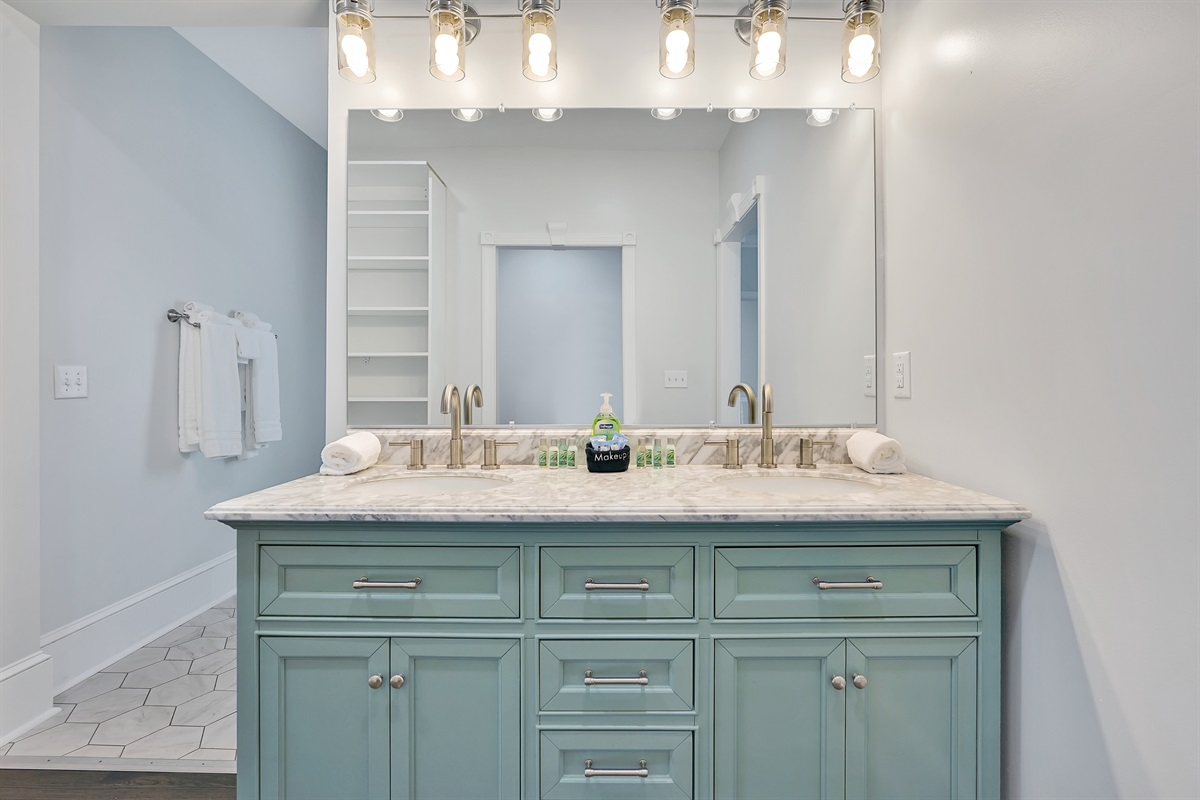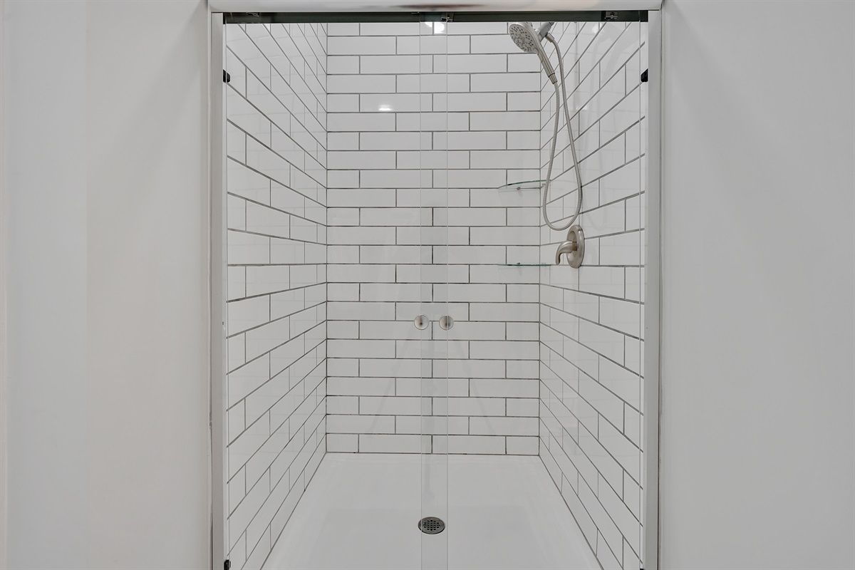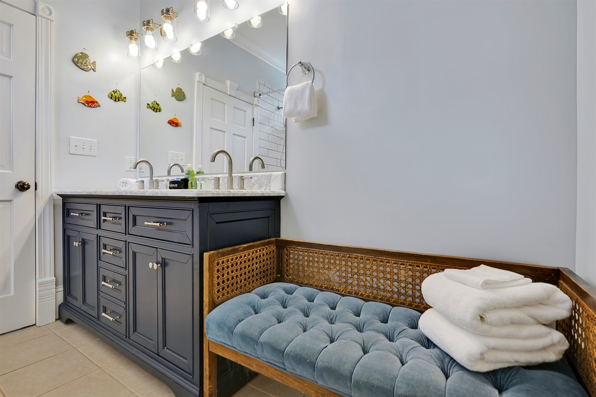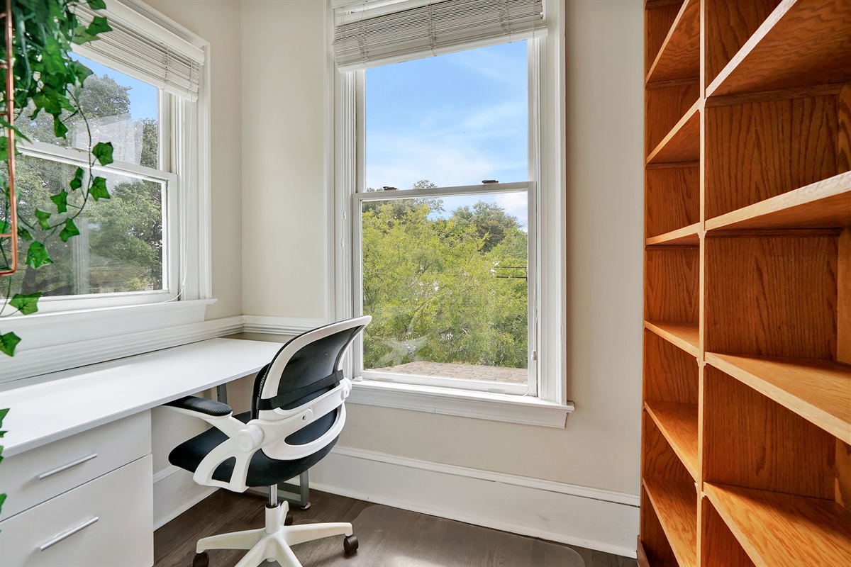 The oversized primary suite has a comfortable king bed, lovely natural light, a walk in closet, an office, and a large bathroom with tiled shower.