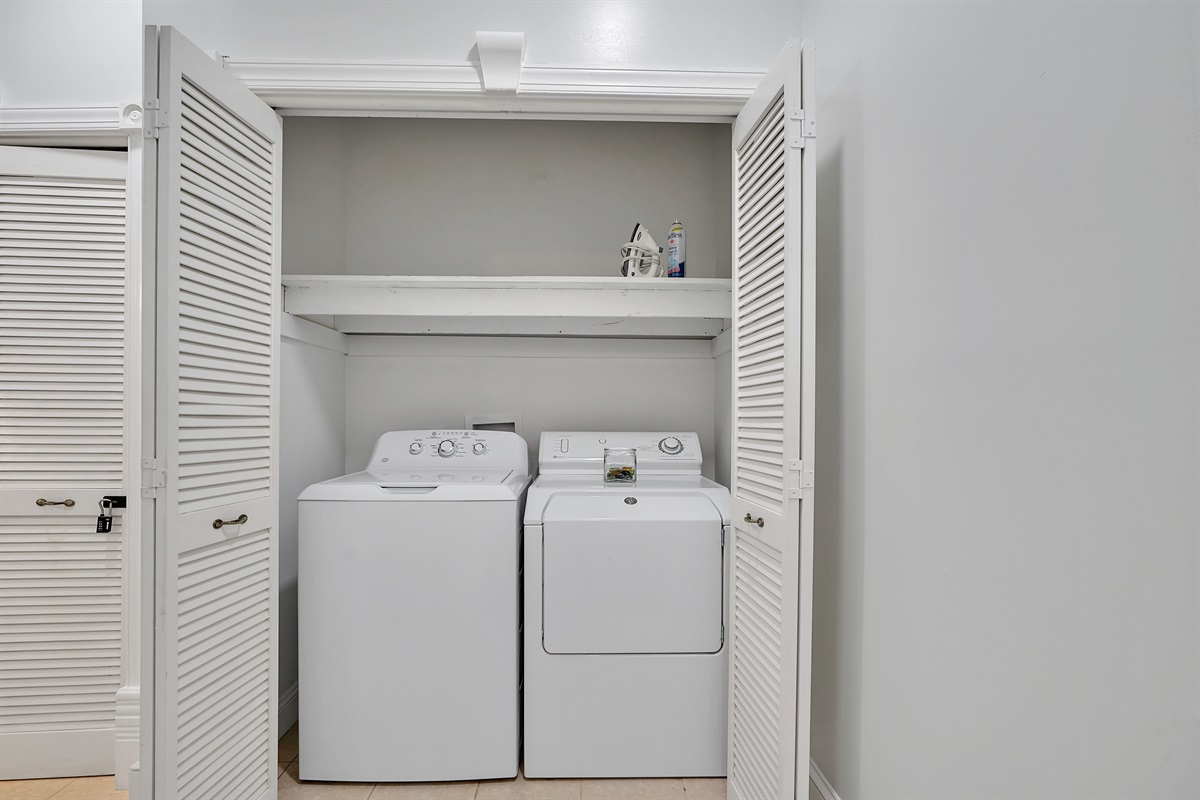 The 2nd floor full bath in the hallway has nice tile work and a bathtub and shower. Next to that is a washer and dryer.
