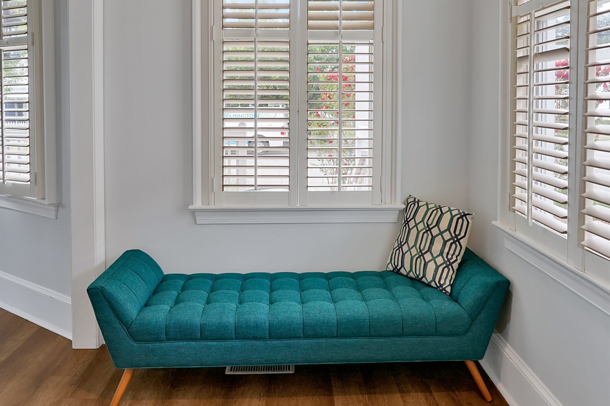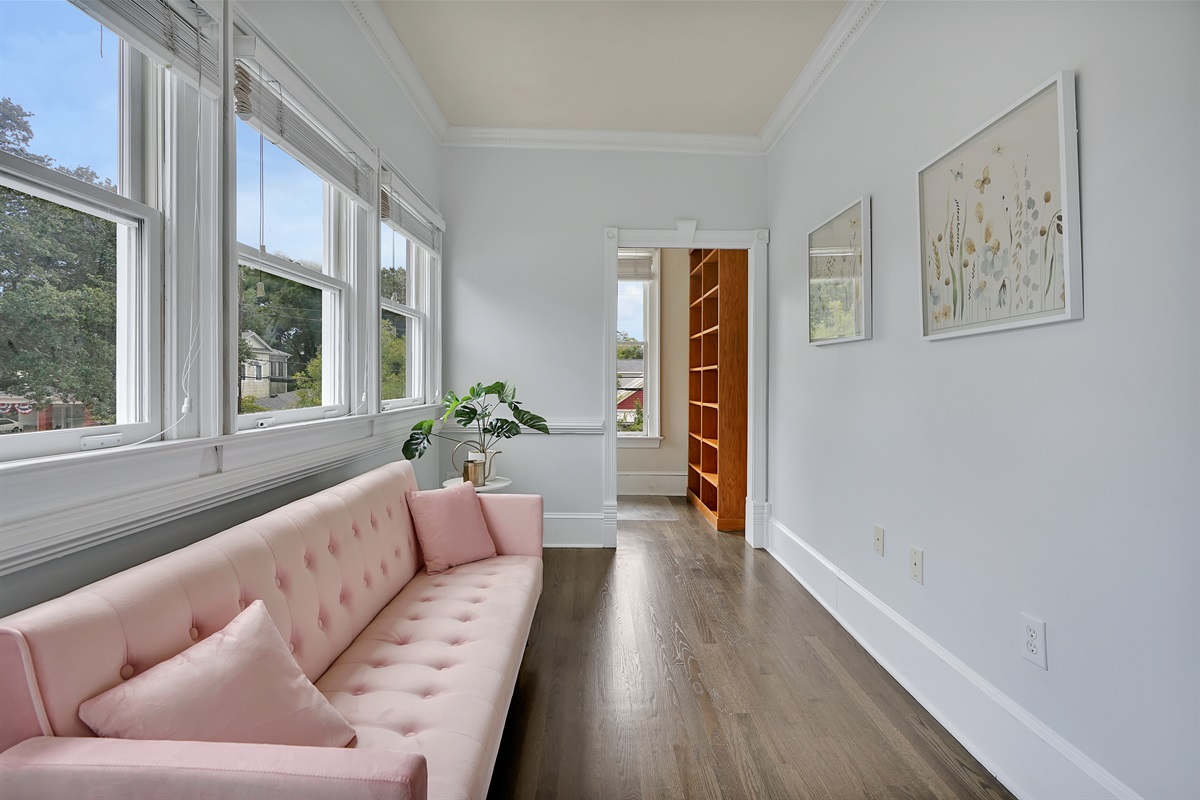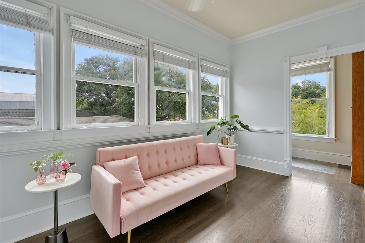 The remaining sleeping space is the sunroom located off of the primary suite and has a stylish fold-down couch and bedding.