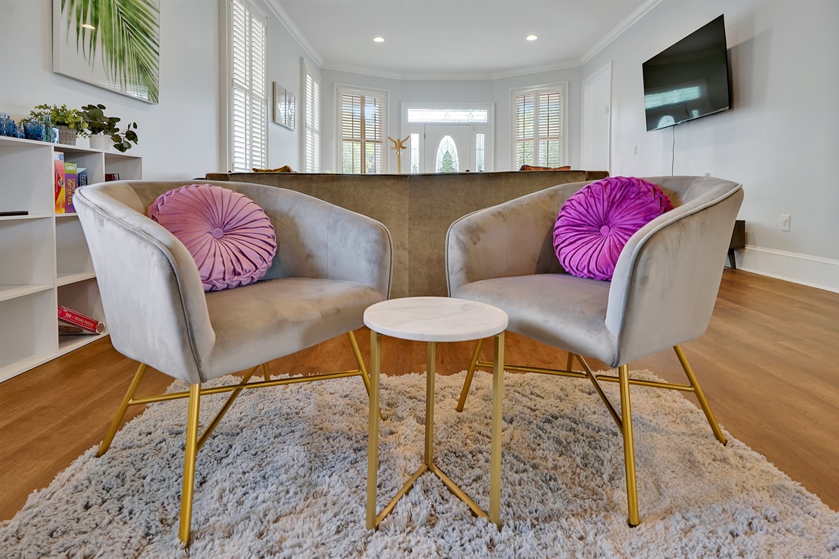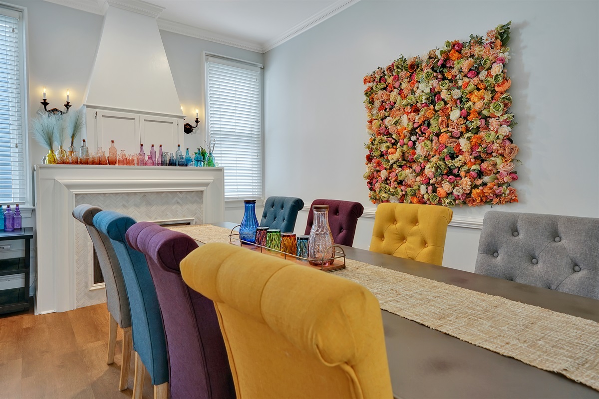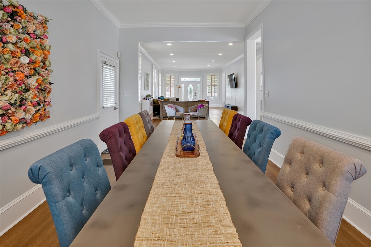 The house is arranged so that the entire first floor is gathering space and the entire second floor is sleeping space, and it makes it easy for guests to co-exist with different sleeping schedules. The spacious open concept living room has a large couch and additional comfortable seating and a smart TV. The colorful dining room has a long table and 8 chairs, and could seat 10.