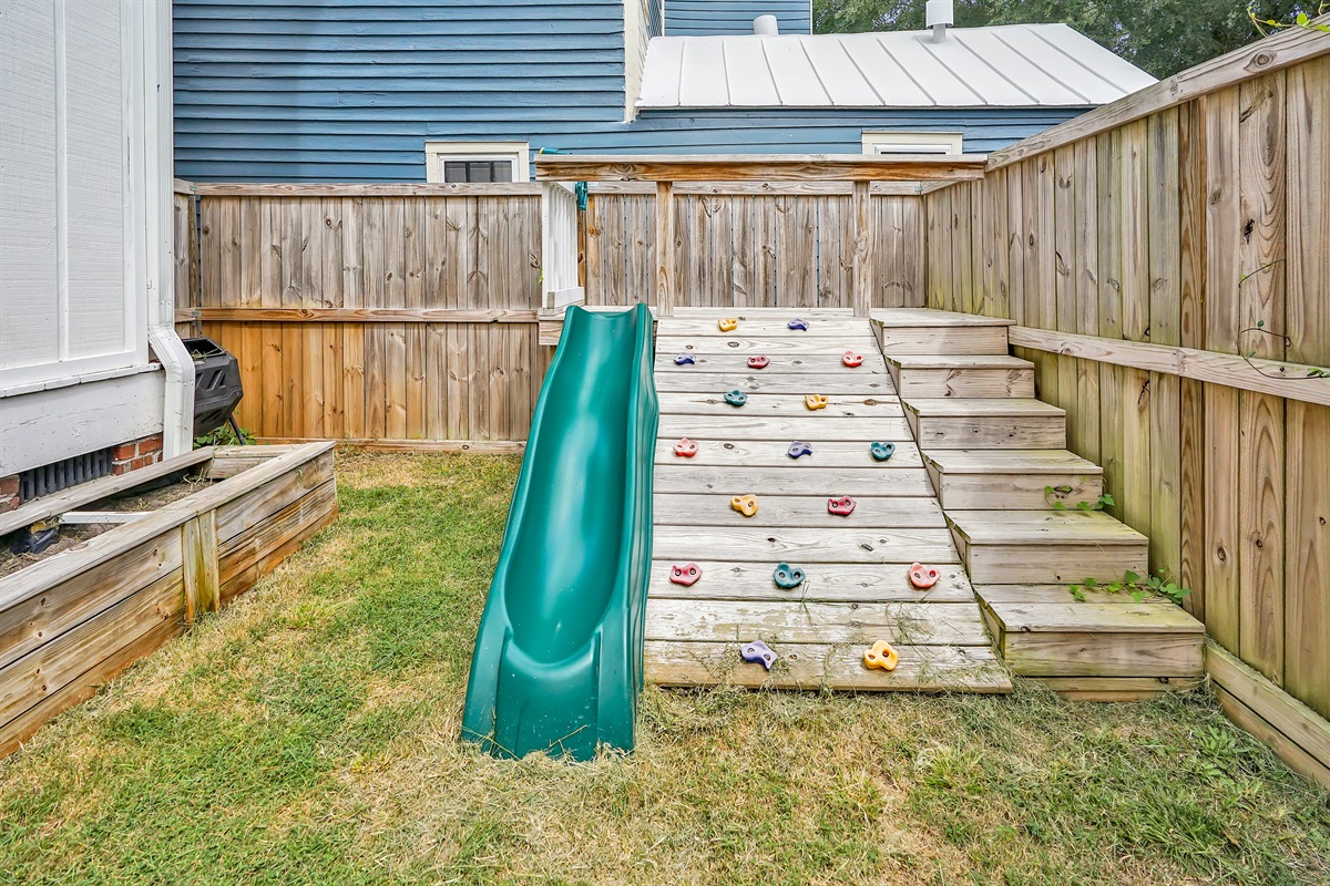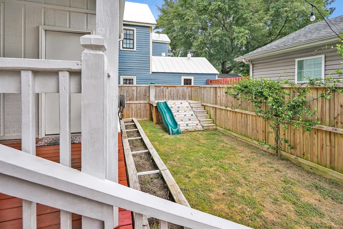 The backyard with a privacy fence is perfect for a family gathering. There is plenty of seating on the porch and additional seating in the yard. There is a small play set for the kids too!