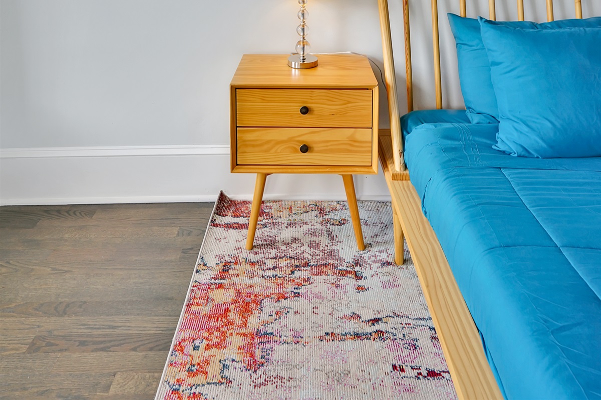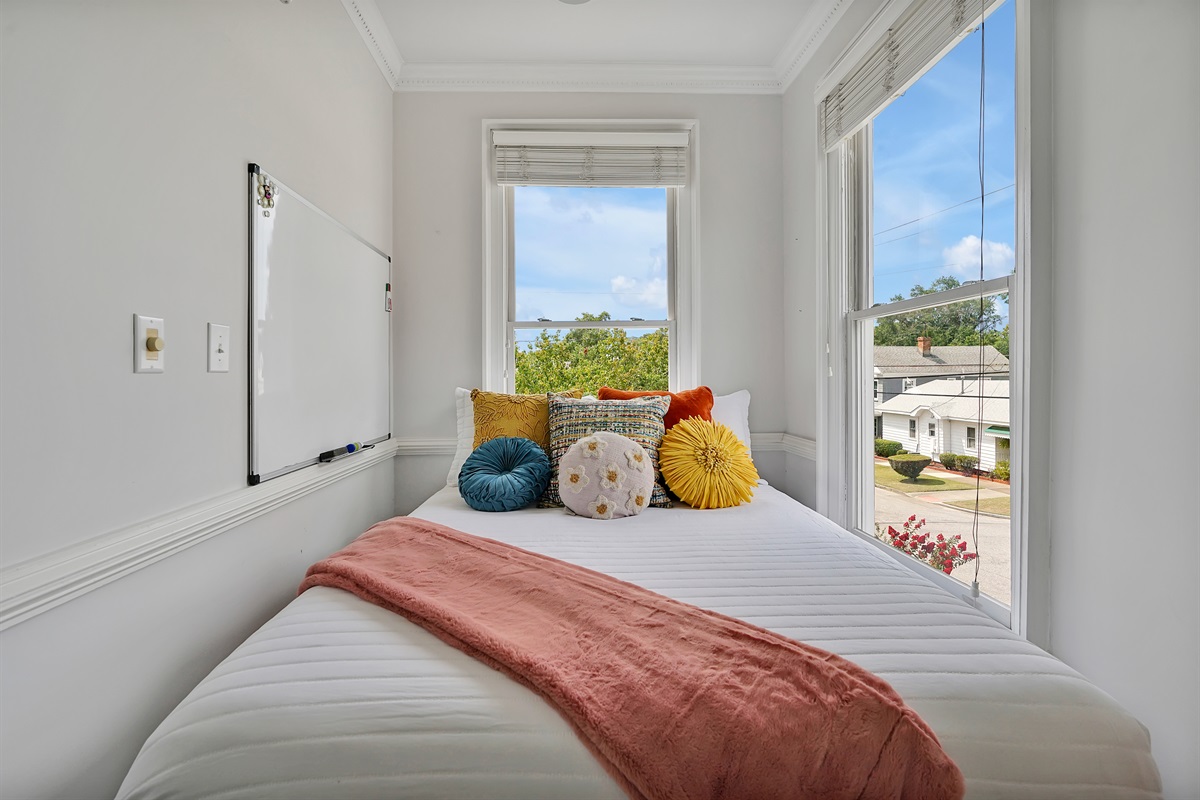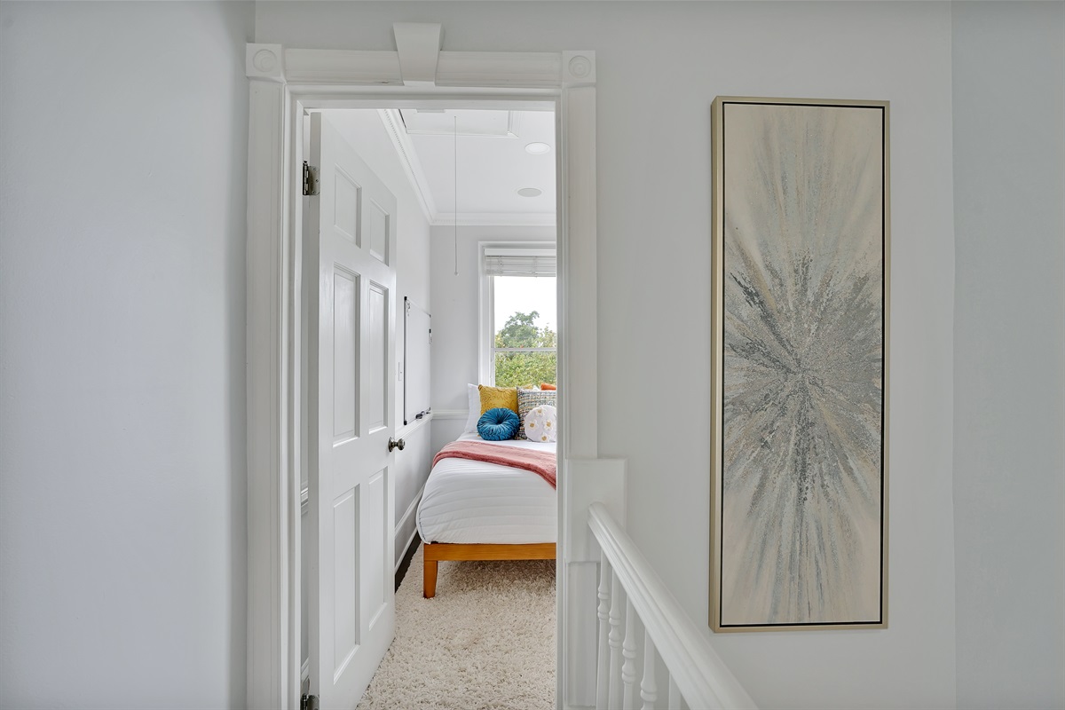 At the top of the stairs is a small bedroom that would have originally been a nursery, but now has a queen sized bed and can sleep two. It’s perfect for the kids!