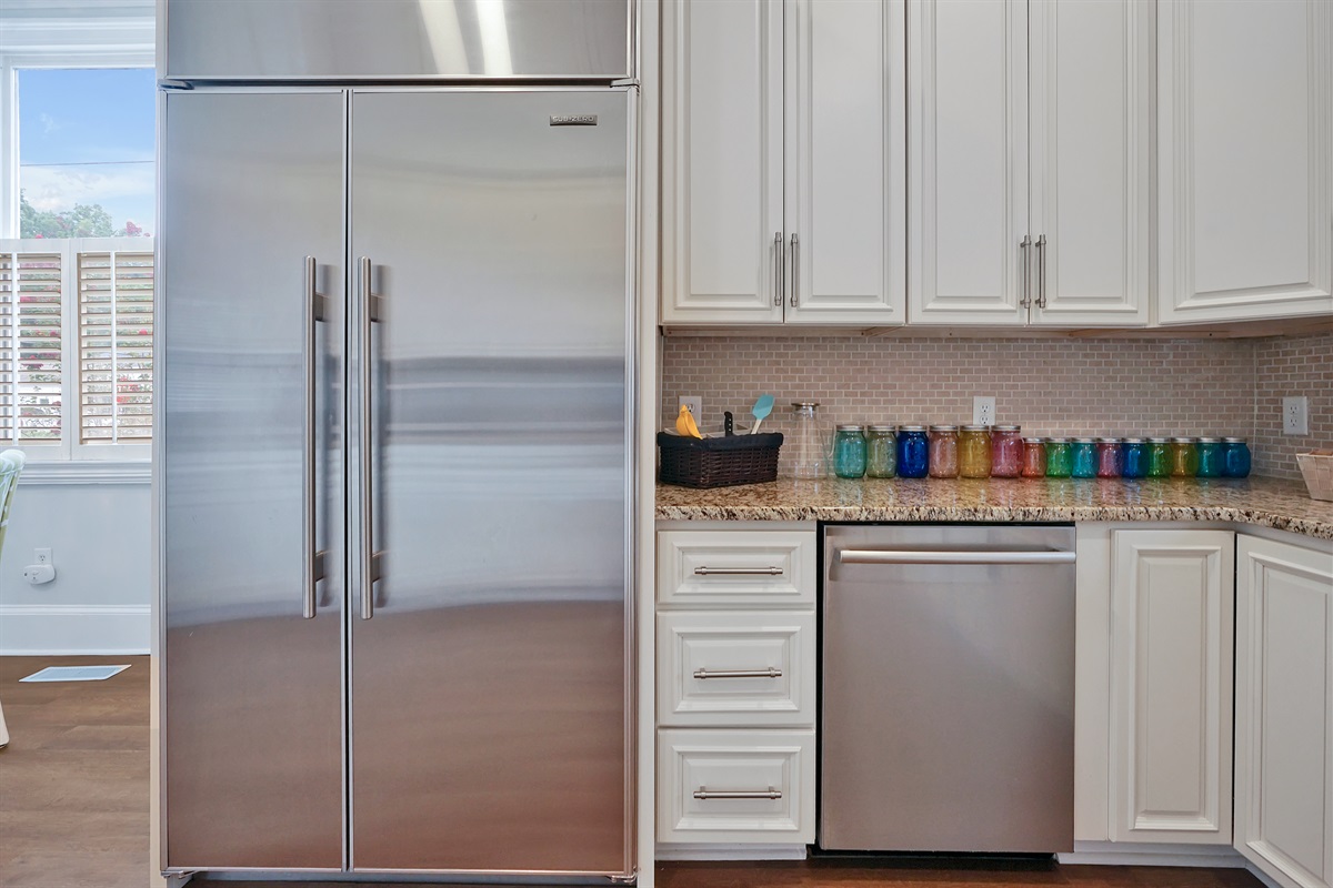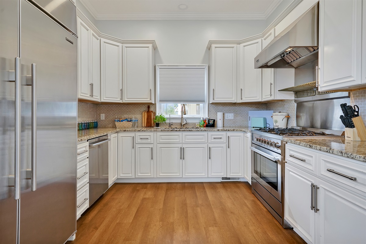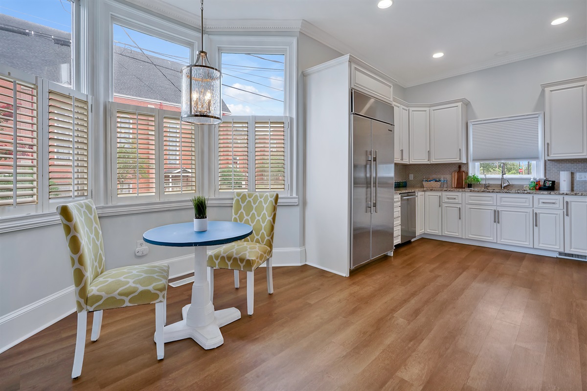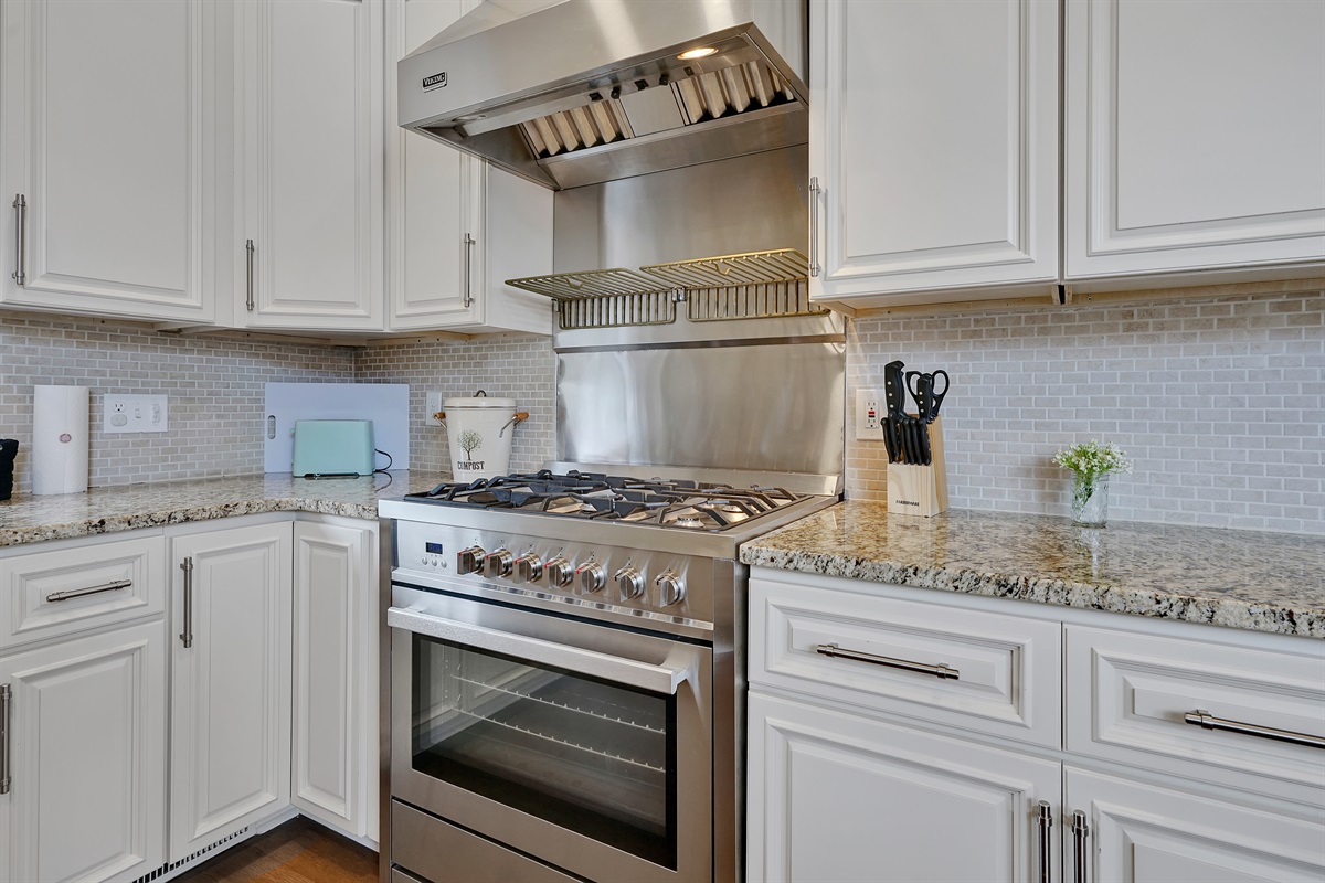 The gourmet kitchen is located next to the dining room and boasts a commercial gas range, custom cabinetry, granite countertops, a breakfast nook, and all of the kitchen basics you’ll need so you can feed the whole crew.
